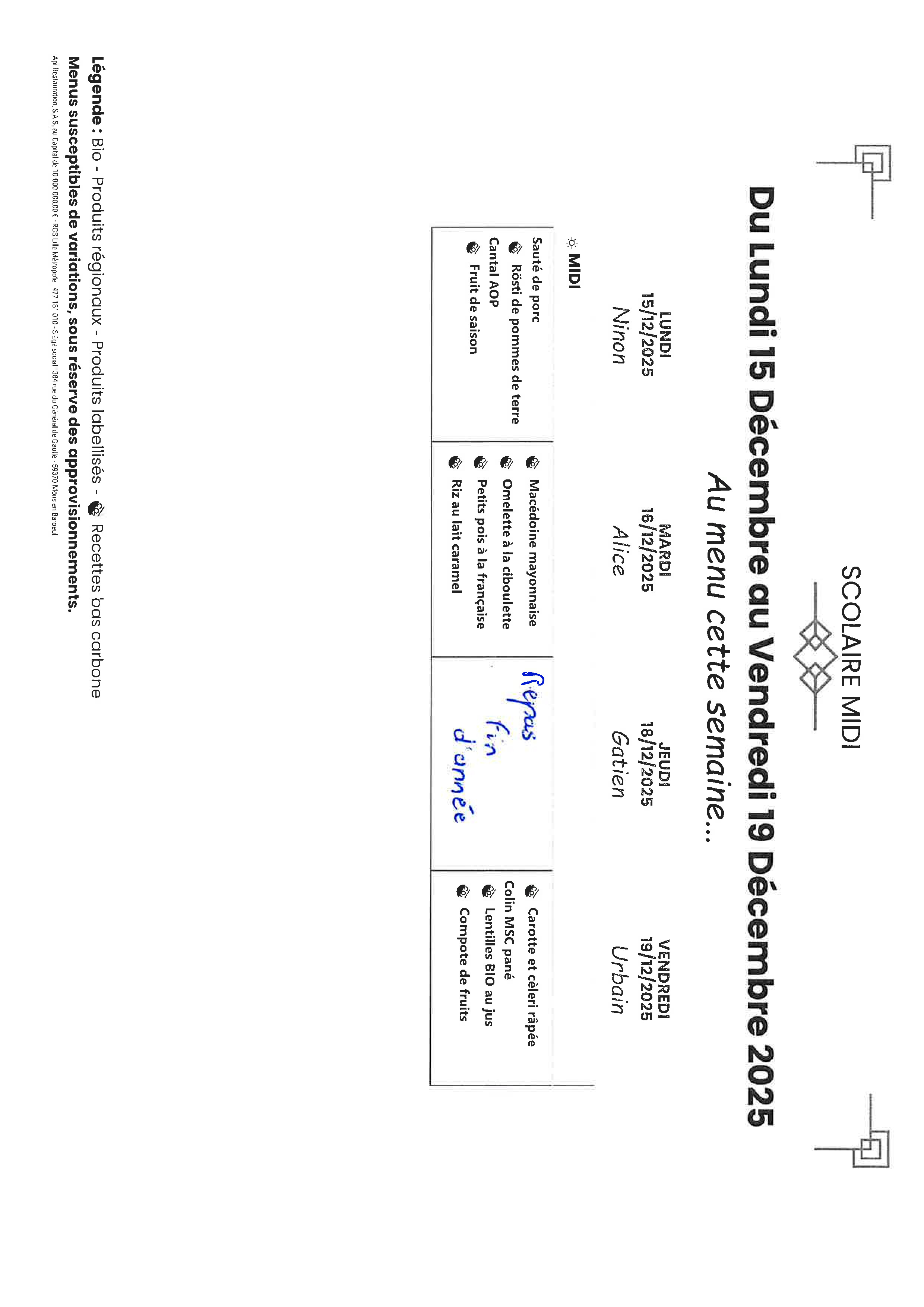 Menus SCOLAIRES du 15 au 19 décembre 2025